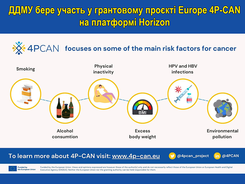 Проєкт 4P-CAN на платформі Horizon (Personalized CANcer Primary Prevention research through Citizen Participation and digitally enabled social innovation) об’єднує зусилля 17 партнерів та присвячений поліпшенню якості первинної профілактики раку, особливо у країнах Східної Європи.