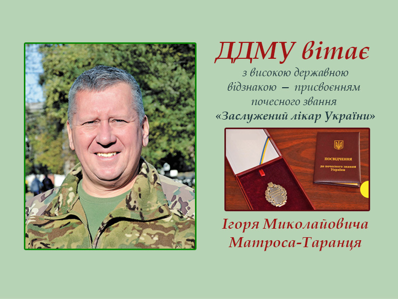 Університетська спільнота щиро вітає в.о. директора Медичного центру Дніпровського державного медичного університету професора Ігоря Миколайовича Матроса-Таранця з присвоєнням почесного звання «Заслужений лікар України» — згідно з Указом Президента №424/2025 «Про відзначення державними нагородами України з нагоди Дня Конституції України».