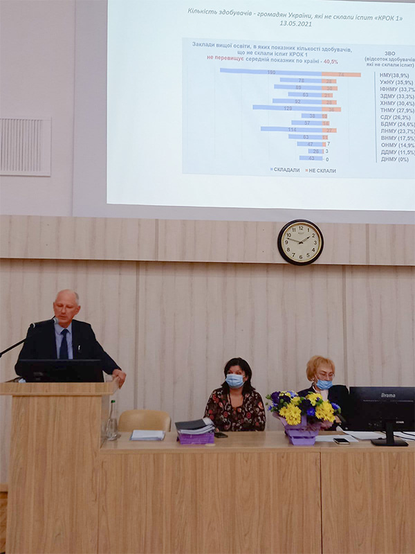 Відповідно до порядку денного перший проректор, професор І. С. Шпонька виступив з доповіддю: «Результати складання єдиного державного кваліфікаційного іспиту у 2020 – 2021 навчальному році». Доповідач зазначив, що ліцензійний іспит «Крок 2» закінчив своє самостійне існування у зв’язку із завершенням підготовки за напрямом спеціаліст. У подальшому він буде складовою частиною ЄДКІ. Випускники – вітчизняні громадяни 2021 року успішно виконали завдання й отримали 2-й ранг в Україні. Усі профілі дисциплін за показниками були вищі ніж національні. Іноземні громадяни загалом теж покращили результати. Україномовні іноземні студенти отримали 5-й ранг, дещо гірше склали англомовні студенти.