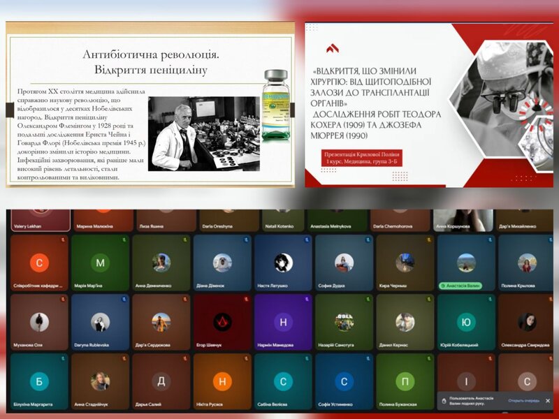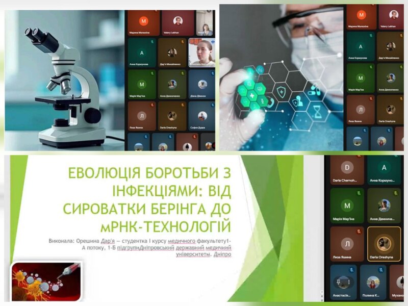 У дистанційному форматі студенти 1 курсу медичного факультету представили результати своїх досліджень, що охопили еволюцію медичної науки за останні 124 роки. Майбутні лікарі проаналізували історичний шлях боротьби медицини з інфекціями від перших сироваток до сучасних мРНК-технологій, еволюція медичних технологій, відкриття в хірургії, персоналізований підхід до лікування пацієнтів.