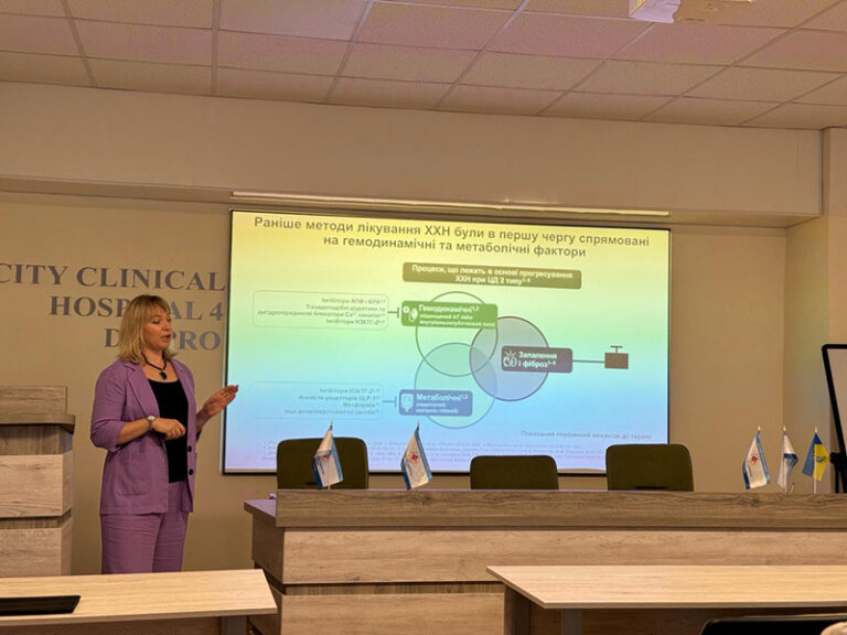 18 червня на базі Міської клінічної лікарні 4 відбулася лекція доцента кафедри внутрішньої медицини 2, фтизіатрії, професійних хвороб і клінічної імунології, канд. мед. наук Євгенії Фролової. Щодо тематики – йшлося про нові можливості в лікуванні хронічної хвороби нирок та цукрового діабету 2 типу в рамках оновлених клінічних рекомендації KDIGO 2024 з акцентом на нефро- та кардіопротекцію. Відновити порушення функції нирок складно, іноді неможливо, однак своєчасне призначення препаратів, які мають ренопротекторну дію, приводить до покращення якості життя і дарують додаткові роки, котрі втрачаються через хворобу.