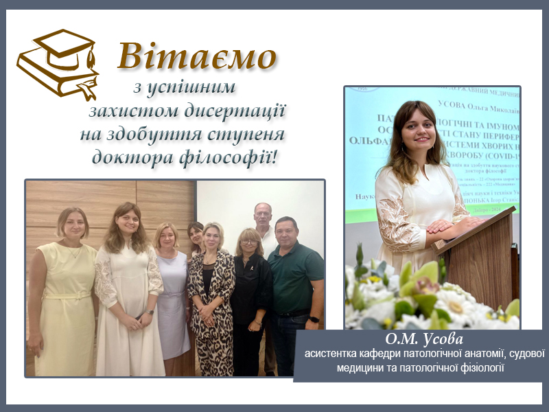 На підставі захисту дисертації спеціалізована вчена рада ДФ 08.601.125 під головуванням професорки Литвин Катерини Юріївни ухвалила присудити ступінь доктора філософії О.М. Усовій, спеціальність «Медицина», галузь знань «Охорона здоров’я».