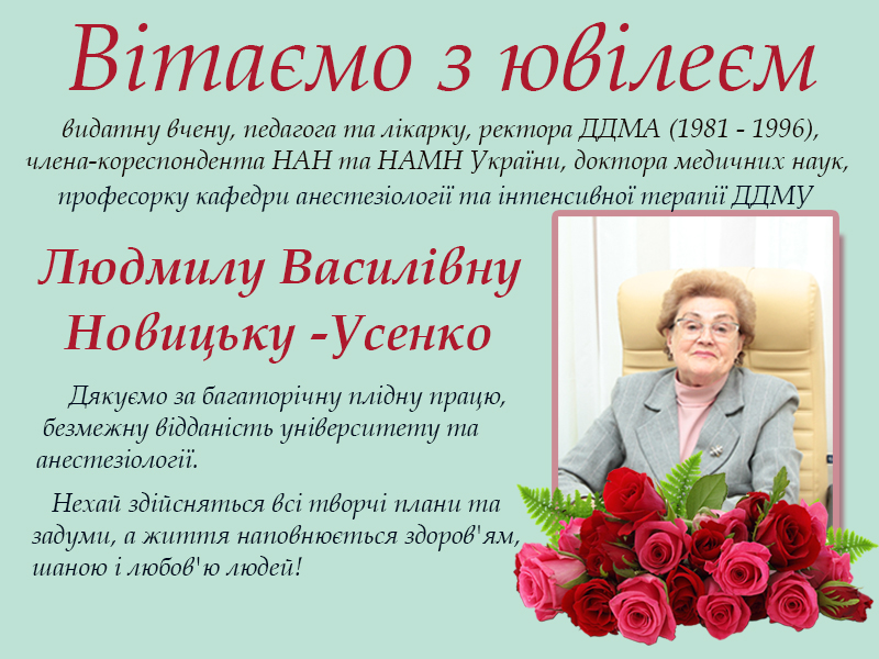 10 липня виповнюється 90 років видатному вченому, одному з засновників анестезіології та реаніматології в Україні, члену-кореспонденту НАН та НАМН України, доктору медичних наук, професору кафедри анестезіології та інтенсивної терапії Дніпровського державного медичного університету, заслуженому діячу науки України, лауреату Державної премії України в галузі науки та техніки Людмилі Василівні Новицькій-Усенко.