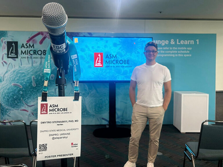 Як ASM Ambassador в Україні участь у цій масштабній науковій події взяв завідувач кафедри мікробіології, вірусології, імунології, епідеміології та медико-біологічної фізики і інформатики ДДМУ професор Дмитро Степанський. Він модерував віртуальну сесію, в якій були представлені роботи багатьох науковців зі всієї України. П’ятеро колег з Дніпра — серед них доцентка кафедри мікробіології, вірусології, імунології, епідеміології та медико-біологічної фізики і інформатики Ірина Кошова, доцент кафедри біохімії та медичної хімії Богдан Мурашевич та студентка 3 курсу ДДМУ, Young ASM Ambassador в Україні Юлія Лапа — взяли участь у заході онлайн або стали співавторами постерів.