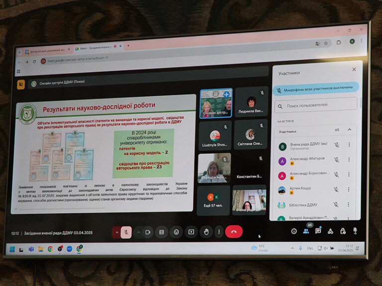 3 квітня в режимі онлайн відбулося чергове засідання вченої ради ДДМУ під головуванням академіка НАМН України, професора Т. О. Перцевої.
