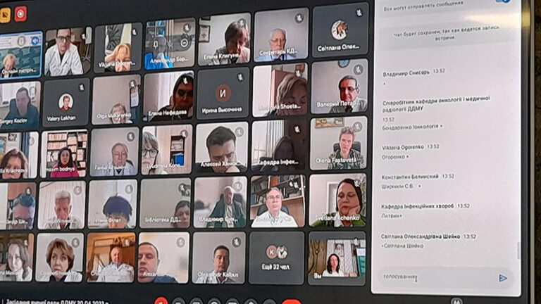 20 квітня 2023 року в дистанційному форматі відбулося чергове засідання вченої ради ДДМУ під головуванням академіка НАМН України, професора Т. О. Перцевої. На порядку денному стояло три питання.