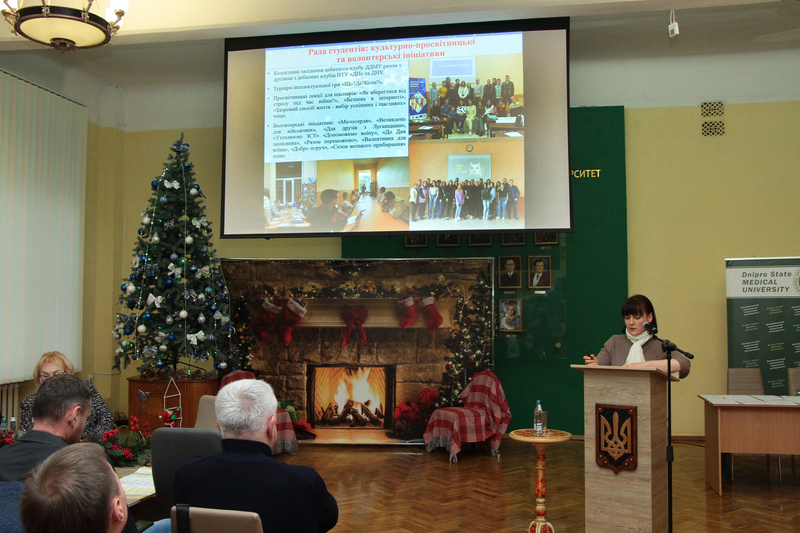 Доповідач проінформувала про комплекс заходів з виховної роботи, які були реалізовані протягом навчального року. Відзначила активну діяльність ради студентів щодо організації та проведення культурно-просвітницьких заходів для молоді, серед яких: колективні засідання дебатного клубу ДДМУ разом з дебатними клубами НТУ «ДП», та ДНУ; просвітницькі лекції для школярів; турніри інтелектуальної гри «Що? Де? Коли?».