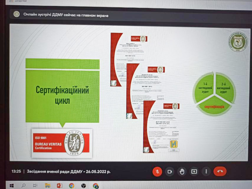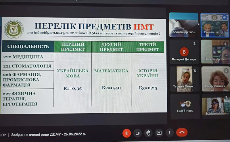 26 травня 2022 року у дистанційному форматі відбулося чергове засідання вченої ради ДДМУ під головуванням академіка НАМН України, професора Т. О. Перцевої. На порядку денному стояло два питання.