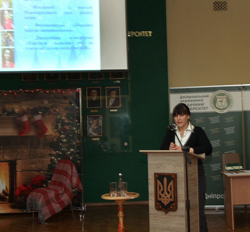 Щодо першого питання порядку денного «Стан виховної, національно-патріотичної та гуманітарної роботи в університеті. Завдання та перспективи» доповідала помічник І проректора з гуманітарно-виховної роботи в університеті доцент О. В. Добридень.