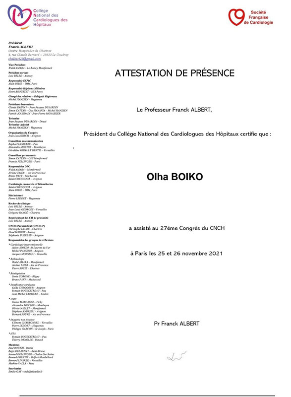 25-26 листопада 2021 р. у м. Париж відбувся 27ème Congrès du Collège National des Cardiologues des Hôpitaux (27th Congress of the National College of Hospital Cardiologist CNCH 2021) від товариства кардіологів Франції, в якому взяла участь аспірант кафедри професійних хвороб, клінічної імунології і клінічної фармакології Ольга Бойко. Власні дослідження молодого вченого, проведені під керівництвом професора кафедри Вікторії Всеволодівни Родіонової, отримали високу оцінку провідних кардіологів Франції та Європи, і були нагороджені грантом на участь у конгресі.