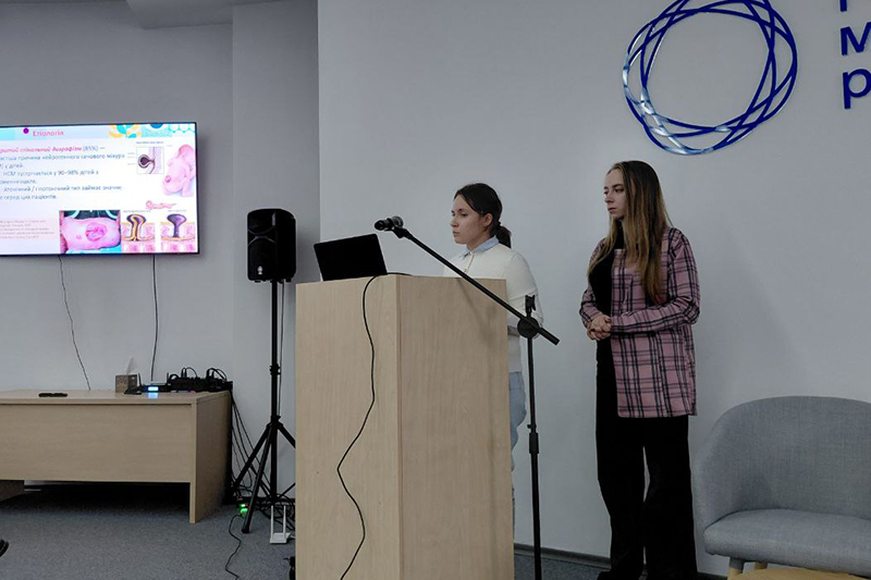 Студентки 5 курсу Дар’я Очигава та Олександра Бабак під керівництвом професора Людмили Вакуленко представили доповідь на тему «Хронічна хвороба нирок у дітей крізь призму клінічного випадку». Особливостями розглянутого кейсу було те, що встановлення діагнозу дівчинці 17 років відбулося на етапі формування хронічної хвороби нирок 4-5 стадії, а як причинний фактор розглядався гіпорефлекторний сечовий міхур. Така патологія потребувала мультидисциплінарного підходу в діагностиці та лікуванні – тісної співпраці дитячих нефрологів та урологів. Готуючись до розбору клінічного випадку, студентки брали активну участь у діагностичному пошуку, зборі анамнезу, аналізі та опису клінічної ситуації, постійно контактували з пацієнткою та лікарями.