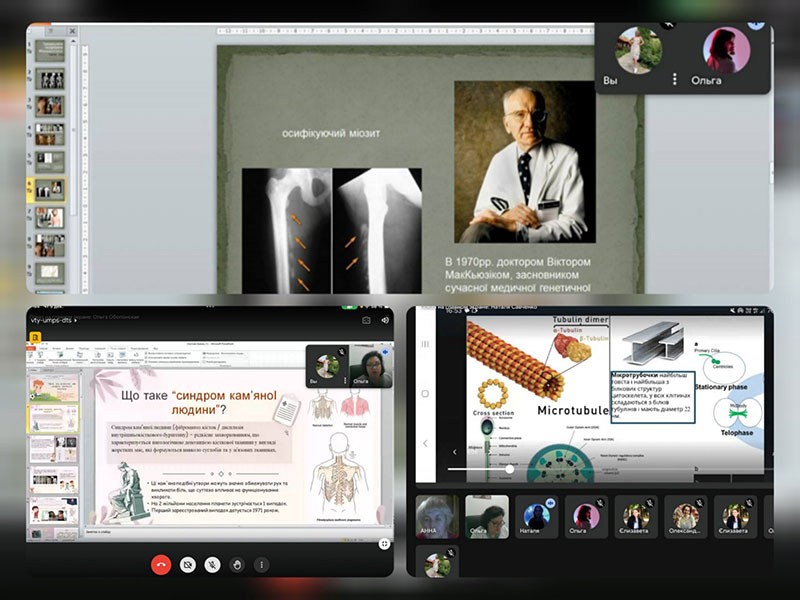 Наступні дві доповіді були присвячені рідкісній генетичної альтерації з різною морфологічною локалізацією, але однаковим ефектом – розвитком кам’яної людини. Студентка 4 курсу Ольга Пасько представила доповідь на тему: «Прогресуюча осифікуюча фібродисплазія». Уляна Клочко на Вероніка Лещук (4 курс) разом з науковим керівником професором С. І. Ільченко виступили на тему: «Stone boy syndrome або синдром камʼяного хлопчика».