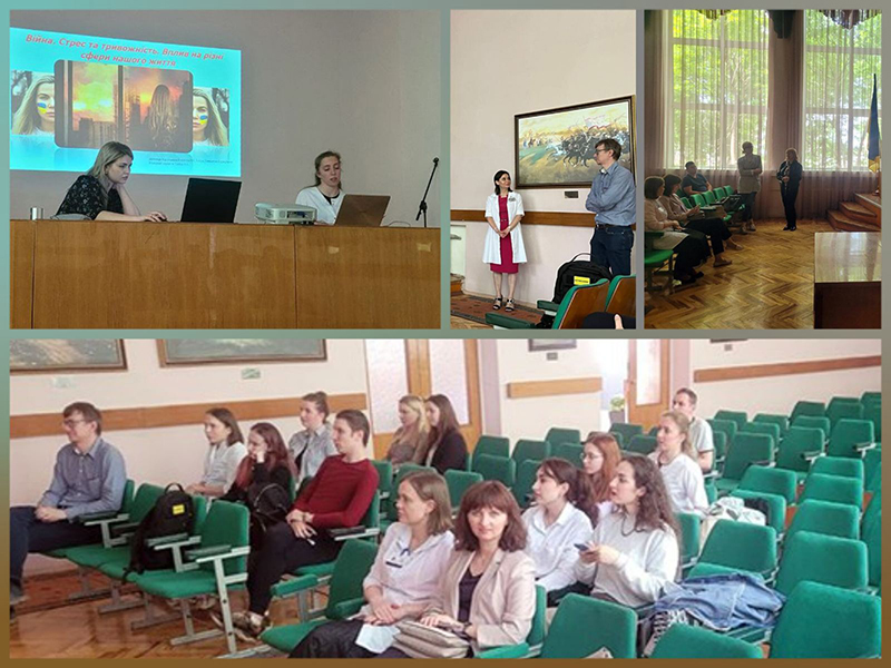 Відкрила засідання студентка 5-го курсу Анна Вороніна з цікавими результатами власного дослідження щодо впливу війни на повсякденні звички студентів ДДМУ. Анна зазначила, що у молоді підвищився рівень тривоги та депресії, і це вплинуло на всі сфери життя респондентів. Так, багато хто почав «заїдати» стрес їжею, що призвело до збільшення маси тіла; деякі з опитаних почали частіше вживати алкоголь. Відзначалося також порушення сну, зниження жаги до навчання і здатності запам’ятовувати нову інформацію. Суттєва частина опитаних задля боротьби з тривогою та депресією самостійно почала приймати лікарські засоби, зокрема і сильнодійні, що є позитивним фактом. Загалом доповідь викликала неабияку цікавість присутніх, а професори В. Огоренко та Л. Конопкіна побажали доповідачеві розвивати свою наукову роботу з цієї тематики.