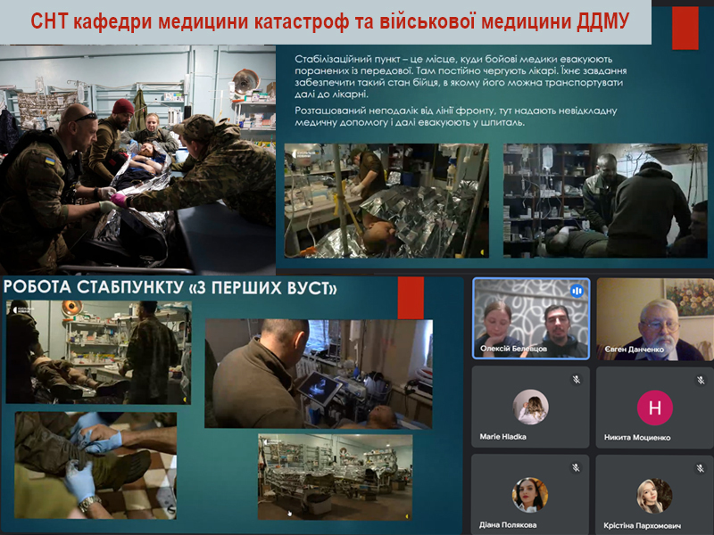 Студенти Олексій Белевцов та Дар’я Кравченко представили доповідь про завдання, оснащення та організацію стабілізаційного пункту як одного з етапів евакуаційно-медичного забезпечення військовослужбовців ЗСУ. Стабілізаційний пункт, або як пишуть в медіа «місце, куди бойові медики евакуюють поранених з передової», зазвичай розташовується на відстані 3-5 км від поля бою. Це наступне після медичних пунктів батальйону місце, де надається перша медична допомога пораненим. Староста гуртка звернула увагу слухачів на актуальність даної теми.