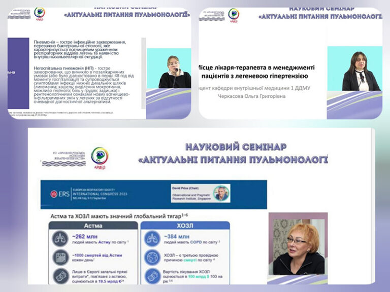 Були представлені 12 доповідей. Відкрила семінар голова ГО «Придніпровська асоціація лікарів-інтерністів», академік НАМН України, професор Т. О. Перцева, яка привітала учасників та виступила з доповіддю на тему «Сучасний погляд на лікування ХОЗЛ». Також виступили доктор мед. наук Я. О. Дзюблик (провідний науковий співробітник ДУ «Національний інститут фтизіатрії і пульмонології ім. Ф. Г. Яновського НАМН України»), професор Л. І. Конопкіна (завідувач кафедри внутрішньої медицини 1 ДДМУ), професор В. В. Родіонова (кафедра внутрішньої медицини 2, фтизіатрії, професійних хвороб і клінічної імунології ДДМУ), доктор мед. наук О. А. Суховерша (доцент, онкохірург вищої категорії, співробітник торакального відділення КНП «МКЛ №4» ДМР), доценти кафедри внутрішньої медицини 1 ДДМУ О. В. Мироненко, Т. В. Кірєєва, О. Г. Черкасова, Н. А. Саніна.