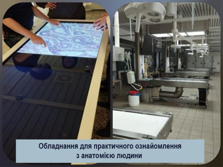 Уже в перший день стажування керівник підрозділу анатомії та молекулярної ембріології професорка Беате Бранд-Сабері особисто провела екскурсію, продемонструвавши сучасний стан матеріально-технічної бази. Медичний корпус має одну класичну лекційну аудиторію на 350 слухачів, місткість якої планують збільшити найближчого року до 400 місць. В цій аудиторії проводяться лекції з різних дисциплін. Практичні заняття з гістології проходять у великій залі, оснащеній 85 мікроскопами, підключеними до комп’ютерів (зображення в окулярах і на екранах однакові). На кожному робочому місці наявні спеціально виготовлені набори мікропрепаратів, у тому числі із застосуванням гістохімічних методів. З будь-якого навчального місця зображення можна демонструвати на великому екрані для обговорення. Загалом комплекти дуже якісні, але студенти іноді натрапляють на артефакти. Так, був продемонстрований архів зрізів ембріонів людини, зібраний 50 років тому. З етичних міркувань створення або поповнення такого архіву наразі є неможливим, тому дослідники з інших університетів мають можливість не лише проаналізувати наявні зрізи, але й пофарбувати спеціально залишені для цього зрізи іншими барвниками. Для практичного ознайомлення з анатомією людини студентам доступні пластикові муляжі органів та частин тіла, дві системи мультимедіа у вигляді столів з тачскріном. Проте студенти надають перевагу вивченню біоматеріалу померлих громадян, які за життя заповіли свої тіла для навчання медиків. Такі тіла законсервовані у формаліні ретельно вивчаються на столах секційного типу.