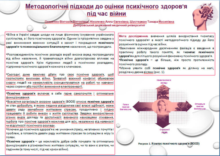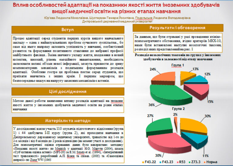 Також були представлені стендові доповіді: «Методологічні підходи до оцінки психічного здоров’я під час війни» (професор Вікторія Огоренко, доцент Алла Ніколенко, доцент Тамара Шустерман) та «Вплив особливостей адаптації на показники якості життя іноземних здобувачів вищої медичної освіти на різних етапах навчання» (професор Людмила Юр’єва, доцент Тамара Шустерман, аспірант Людмила Подольська).