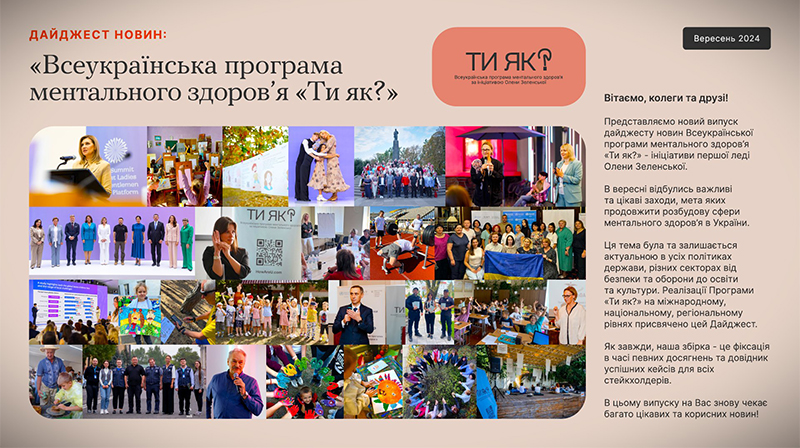 Це фіксація в часі досягнень кожного учасника процесу та довідник кейсів для всіх стейкхолдерів Всеукраїнської програми ментального здоров’я «Ти як?» за ініціативою Олена Зеленська. Дайджест існує у діджитал-форматі, тому є доступним для перегляду в електронному вигляді, також його можна завантажити та роздрукувати.