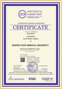 ДДМУ отримав сертифікат про міжнародну акредитацію освітньої програми «222 Медицина», рівень магістра
