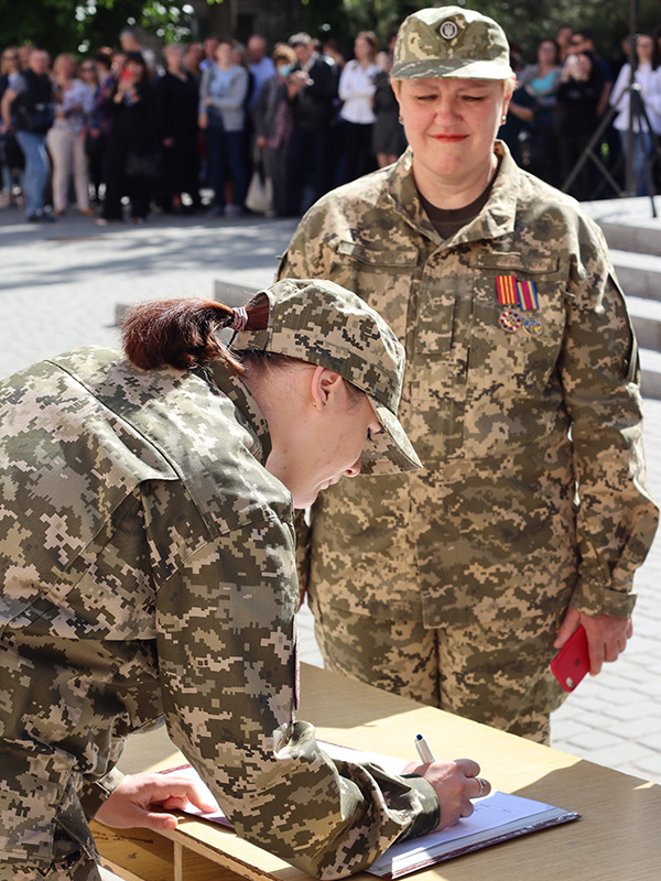 Тетяна Олексіївна щиросердо привітала майбутніх офіцерів запасу із знаменною подією в їхньому житті і наголосила: «Як би не склалась ваша доля по завершенні навчання в ДДМУ, ви назавжди залишитесь військовими лікарями, які присягли на вірність українському народу». Побажала світлої, щасливої життєвої дороги, успіхів на благородній лікарській ниві.