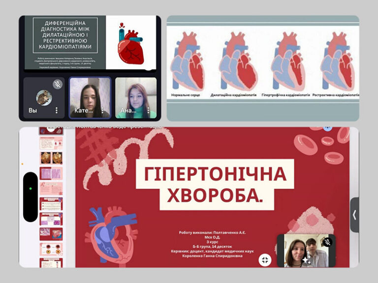 Гіпертрофію міокарда при артеріальній гіпертензії необхідно диференціювати зі змінами при кардіоміопатіях. Восьму доповідь: «Диференційна діагностика дилатаційної та рестриктивної кардіоміопатій», презентували студентки 3 курсу Івашина Катерина та Телевна Анастасія (кафедра патологічної анатомії, судової медицини та патологічної фізіології).
