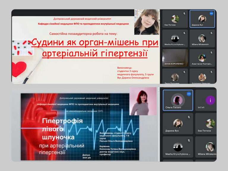 Студентка 3 курсу Вус Дарина (кафедра сімейної медицини ФПО та пропедевтики внутрішньої медицини) презентувала доповідь: «Судини як орган-мішень при артеріальній гіпертензії», детально зупинилась на діагностиці та лікуванні.