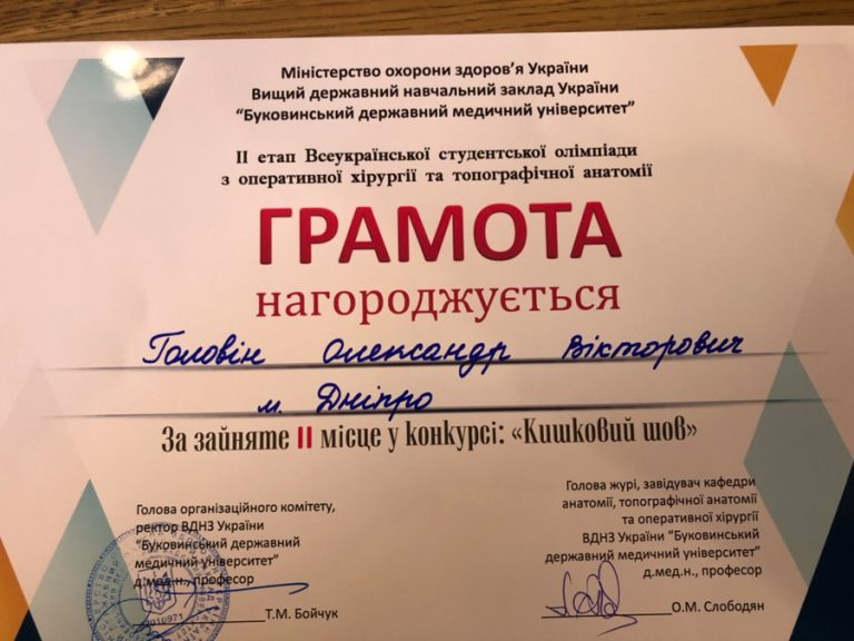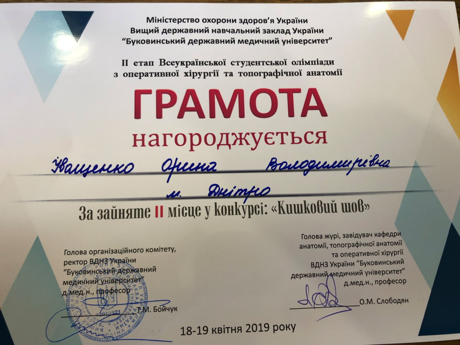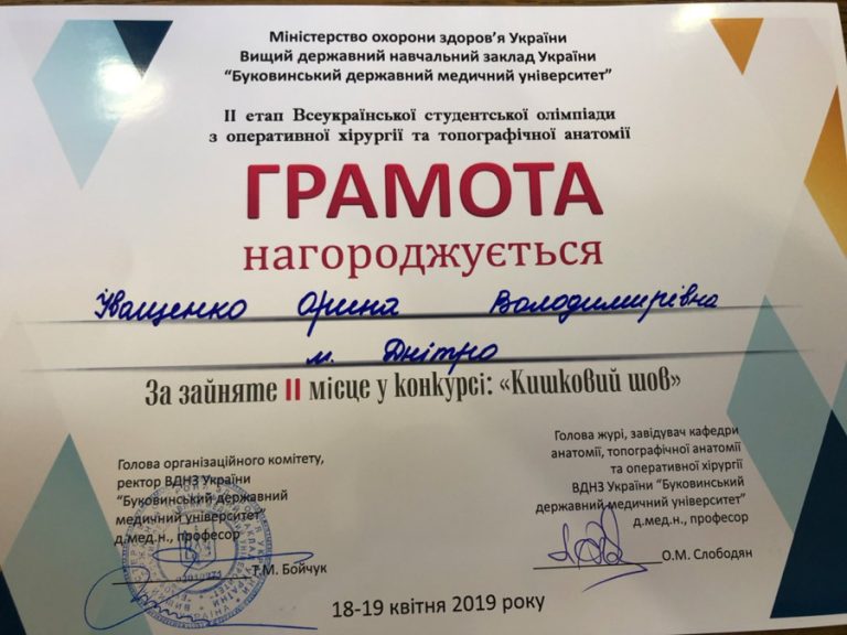 18-19 квітня 2019 року у Буковинському державному медичному університеті (м. Чернівці) пройшов 2 етап Всеукраїнської студентської олімпіади з оперативної хірургії і топографічної анатомії.
