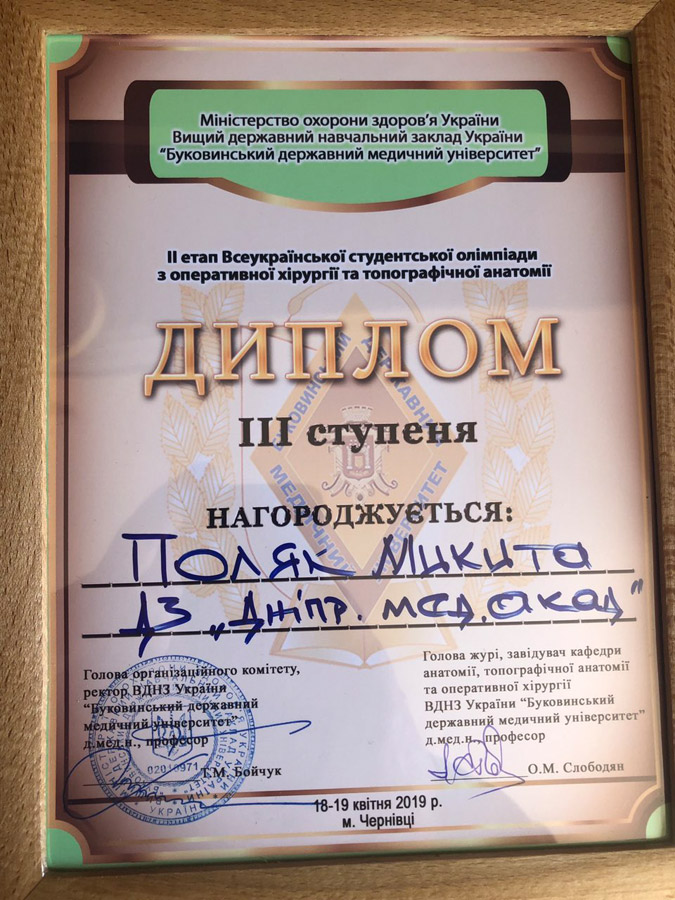 Наша академія була представлена командою з 3 студентів. За результатами змагань студент Поляк Микита посів 3 місце в індивідуальному заліку. Крім цього грамотами нагороджені Іващенко Орина та Головін Олександр за зайняте 2 місце у конкурсі “Кишковий шов”.