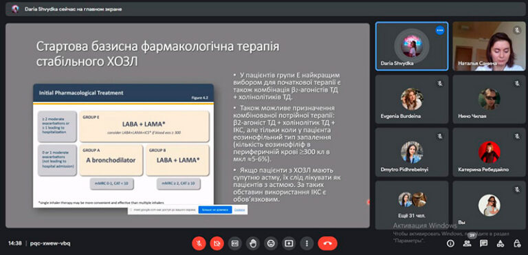 Студентка 4-го курсу медичного факультету Дар’я Швидка підготувала доповідь про підходи до лікування ХОЗЛ у світлі рекомендацій 2023 р. Так, у новому стандарті наголошено на важливості раннього застосування комбінованої терапії бронходилататорами пролонгованої дії; чітко окреслено терапевтичне вікно застосування інгаляційних кортикостероїдів у хворих на ХОЗЛ; розроблено алгоритми корекції призначеної інгаляційної терапії залежно від типу прогресування захворювання. Презентація Дар’ї викликала зацікавлення і закінчилася жвавою дискусією учасників засідання.