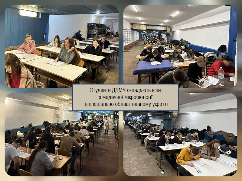 Студенти 3-го курсу медичного та міжнародного факультетів ДДМУ розпочали зимову сесію зі складання іспиту з медичної мікробіології. Іспит проведений на кафедрі мікробіології, вірусології, імунології, епідеміології та медико-біологічної фізики і інформатики в аудиторному форматі. З урахуванням заходів безпеки, він пройшов у спеціально облаштованому укритті.