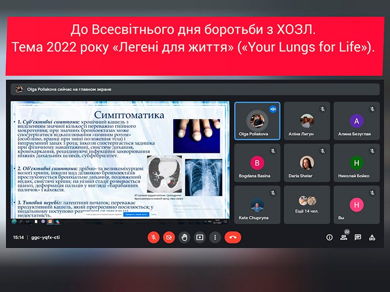 Долучився до дня боротьби з ХОЗЛ і студентський науковий гурток кафедри внутрішньої медицини 1 (керівник – доцент Наталія Саніна). На онлайн-засіданні були присутні студенти 4-го та 5-го курсів ДДМУ, які жваво обговорювали дискусійні питання. Студентка 4-го курсу медичного факультету Ольга Полякова доповідала про перебіг ХОЗЛ, ускладнений розвитком бронхоектазій; студентки 20 десятку 4-го курсу медичного факультету Аліна Лигун і Дар’я Шелар розповіли про сучасні підходи до терапії стабільного ХОЗЛ в Україні. Особливу цікавість слухачів викликала доповідь студентки 19 десятку 4-го курсу медичного факультету Ольги-Розарії Поясової, присвячена дефіциту альфа1-антитрипсину та антитрипсинзамісній терапії.