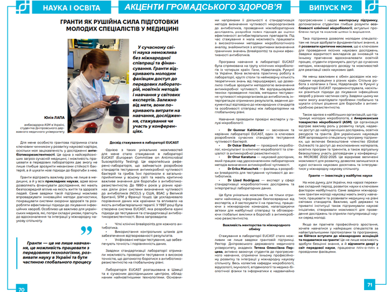 У другому випуску науково-практичного журналу «Акценти громадського здоров’я» (№ 2, 2025), який виходить під редакцією МОЗ України, за запрошенням голови правління Всеукраїнської асоціації фахівців з громадського здоровʼя Руслана Савчука опубліковано статтю студентки 3 курсу Дніпровського державного медичного університету та Young Ambassador Американського товариства мікробіології (ASM) в Україні Юлії Лапи.