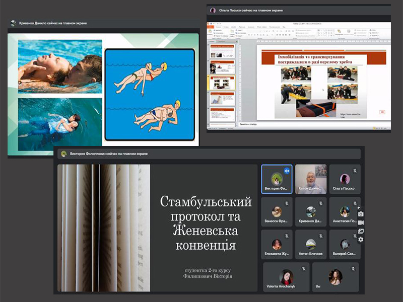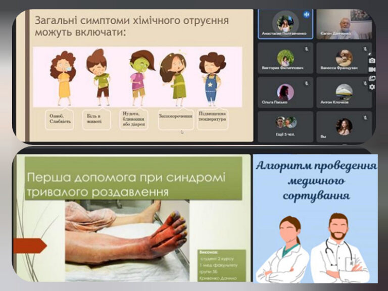 Також була представлена актуальна в умовах сьогодення інформація студента 2 курсу медичного факультету 5-Б групи Данила Кривенка про першу допомогу при синдромі тривалого роздавлення та студентки 2 курсу медичного факультету 4-Б групи Ванесси Французан про сортування поранених та хворих при подоланні наслідків катастроф.
