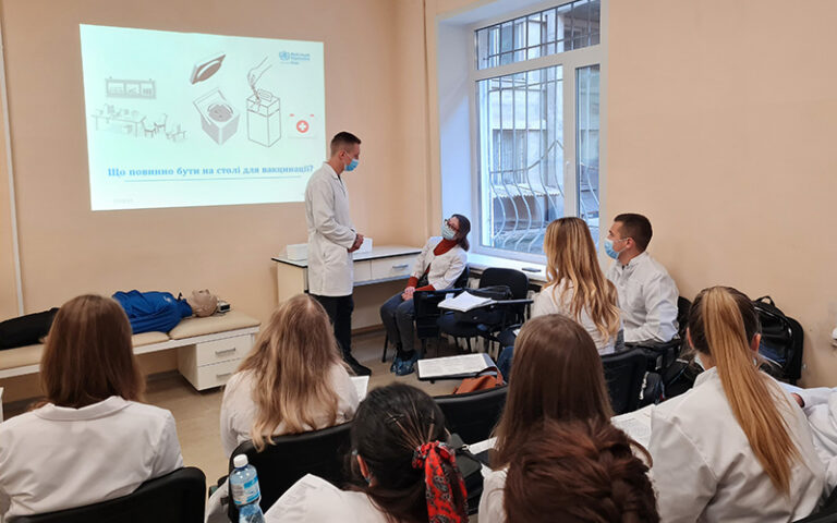 Студенти разом з тренерами центру обговорили ключові питання вимог до виїзних/мобільних сесій вакцинації, отримали практичні поради розрахунків потреби у вакцині та ін’єкційних матеріалах, ознайомилися з технікою та місцем вводу вакцини, правилами утилізації використаних ін’єкційних матеріалів. Тренерами центру були висвітлені основні глобальні рекомендації та питання імунізації. В рамках програми було проведено тренінг з надання першої допомоги, діагностики анафілаксії та реєстру імунізації COVID-19 в системі e-Health.