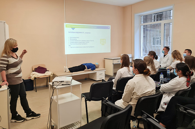 Студенти разом з тренерами центру обговорили ключові питання вимог до виїзних/мобільних сесій вакцинації, отримали практичні поради розрахунків потреби у вакцині та ін’єкційних матеріалах, ознайомилися з технікою та місцем вводу вакцини, правилами утилізації використаних ін’єкційних матеріалів. Тренерами центру були висвітлені основні глобальні рекомендації та питання імунізації. В рамках програми було проведено тренінг з надання першої допомоги, діагностики анафілаксії та реєстру імунізації COVID-19 в системі e-Health.