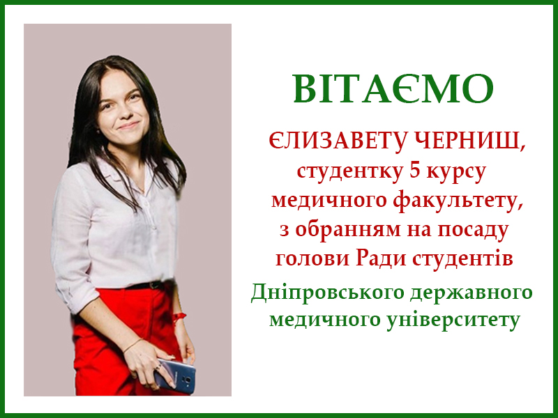 За результатами таємного голосування більшістю голосів головою Ради студентів Дніпровського державного медичного університету обрано Єлизавету Черниш. Дівчина від початку навчання в університеті була старостою своєї підгрупи, а з 4 курсу і до сьогодні є старостою А потоку свого курсу. Ось що Єлизавета розповідає про себе: «Я активна та наполеглива, завжди прагну досягнути своєї мети, відкрита до нових та цікавих пропозицій та проєктів, які будуть корисні для студентів, задля покращення їх саморозвитку, опанування нових навичок для здобуття омріяної професії».