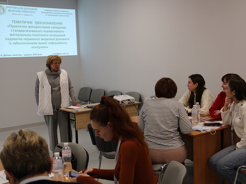 5 листопада 2025 року на кафедрі сімейної медицини, пропедевтики внутрішньої медицини та лабораторної діагностики ДДМУ (завідувачка – професорка І.Л. Височина) за підтримки ВООЗ завершився перший п’ятиденний цикл тематичного удосконалення «Практичне використання складових стандартизованого нормативного матеріально-технічного оснащення надавачів первинної медичної допомоги із забезпеченням вимог інфекційного контролю».