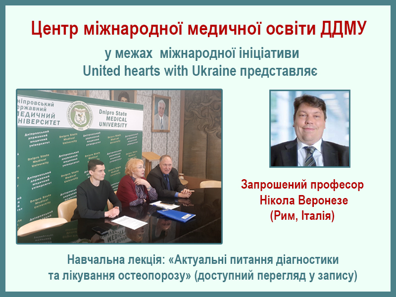 Навчальну лекцію для студентів ДДМУ на тему: «Актуальні питання діагностики та лікування остеопорозу» прочитав професор кафедри геріатрії та внутрішньої медицини Міжнародного університету наук про здоров’я Святого Камілла (Рим, Італія), професор університету короля Сауда, запрошений професор ДДМУ Нікола Веронезе.