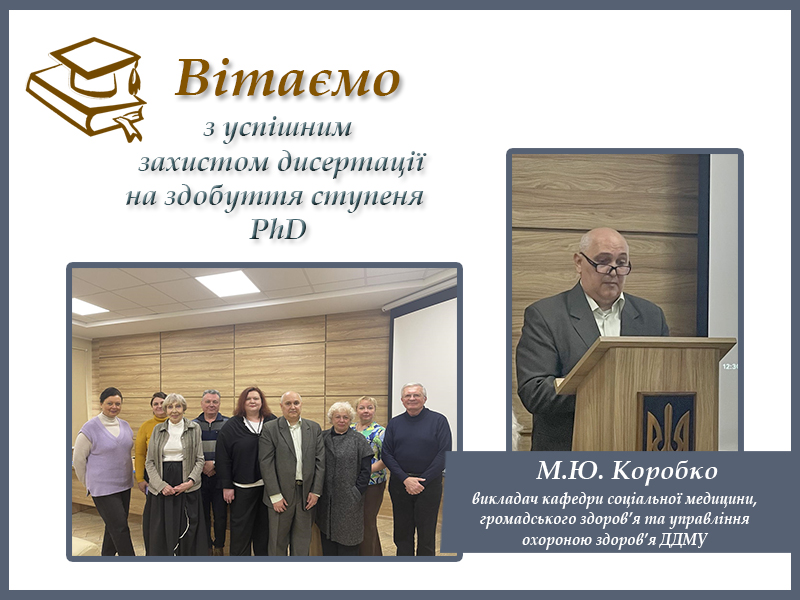 21 травня 2025 року у Дніпровському державному медичному університеті відбувся захист дисертації на здобуття наукового ступеня доктора філософії а спеціальністю «Громадське здоров’я». Свою наукову роботу представив викладач кафедри соціальної медицини, громадського здоров’я та управління охороною здоров’я ДДМУ Михайло Юрійович Коробко.