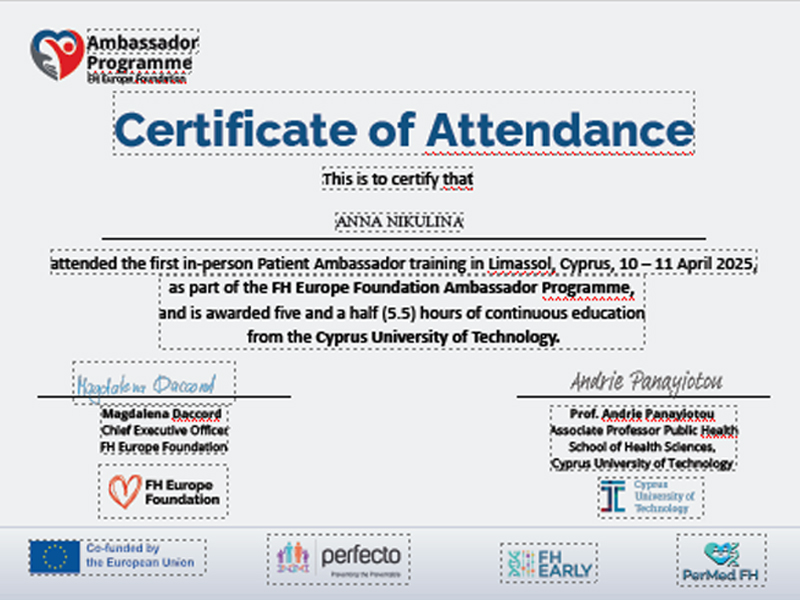 4 травня – День поінформованості про сімейну гомозиготну гіперхолестеринемію. У квітні 2025 року в місті Лімасол (Кіпр) відбувся тренінг партнерів консорціуму FH Europe Foundation (генеральний директор – Magdalena Daccord) у межах проєкту PERFECTO, присвячений темі педіатричного скринінгу СГ з метою запобігання серцево-судинних захворювань.