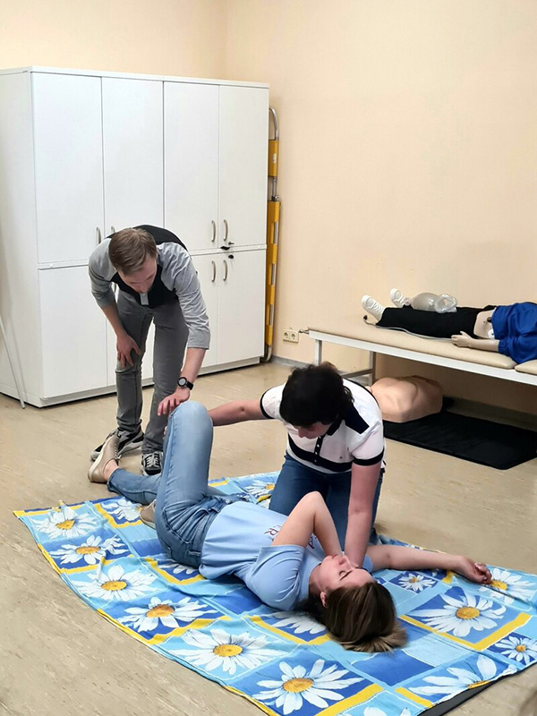 Другий день розпочався з ознайомлення з основами базової серцево-легеневої реанімації (протокол BLS) з використанням автоматичного зовнішнього дефібрилятора (АЗД). Практична частина включала відпрацювання симуляційних сценаріїв «Базова серцево-легенева реанімація з використанням АЗД, особливі випадки, стабільне бокове положення».