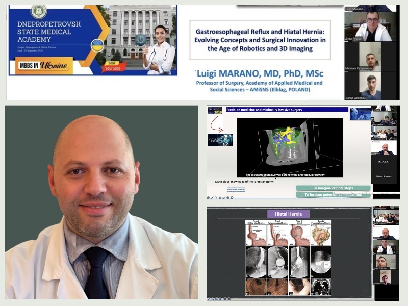 5 травня 2025 року на базі кафедри хірургії № 1 та урології Дніпровського державного медичного університету в онлайн-форматі відбулася лекція професора Луїджі Марано (Luigi Marano, MD, PhD) на тему «Gastroesophageal Reflux and Hiatal Hernia: Evolving Concepts and Surgical Innovation in the Age of Robotics and 3D Imaging».