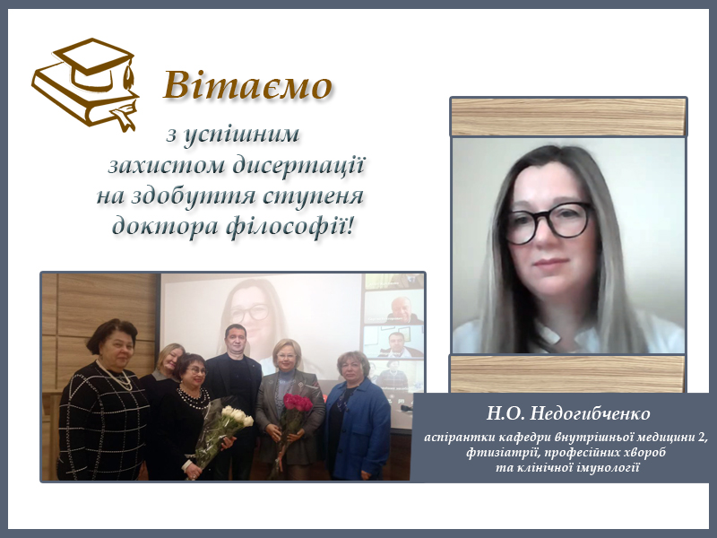 На засіданні спеціалізованої вченої ради 08.601.092 під головування професора Тетяни Вікторівни Святенко було розглянуто дисертацію здобувача ступеня доктора філософії, аспірантки кафедри внутрішньої медицини 2, фтизіатрії, професійних хвороб та клінічної імунології ДДМУ Наталі Олександрівни Недогибченко.