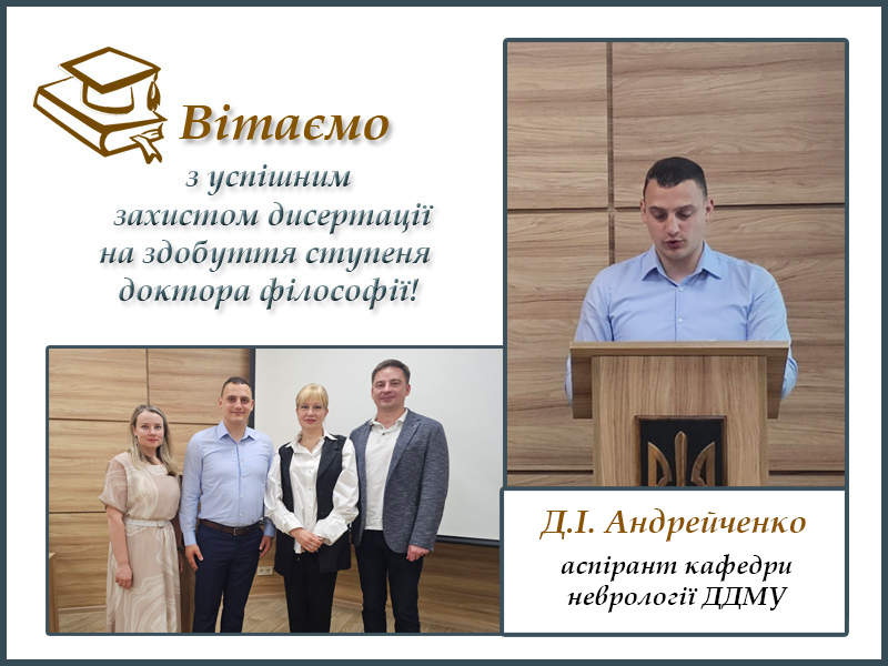 На підставі захисту дисертації спеціалізована вчена рада під головуванням професорки Огоренко Вікторії Вікторівни ухвалила присудити Андрейченку Дмитру Ігоровичу ступінь доктора філософії. Спеціальність «Медицина», галузь знань «Охорона здоров’я».