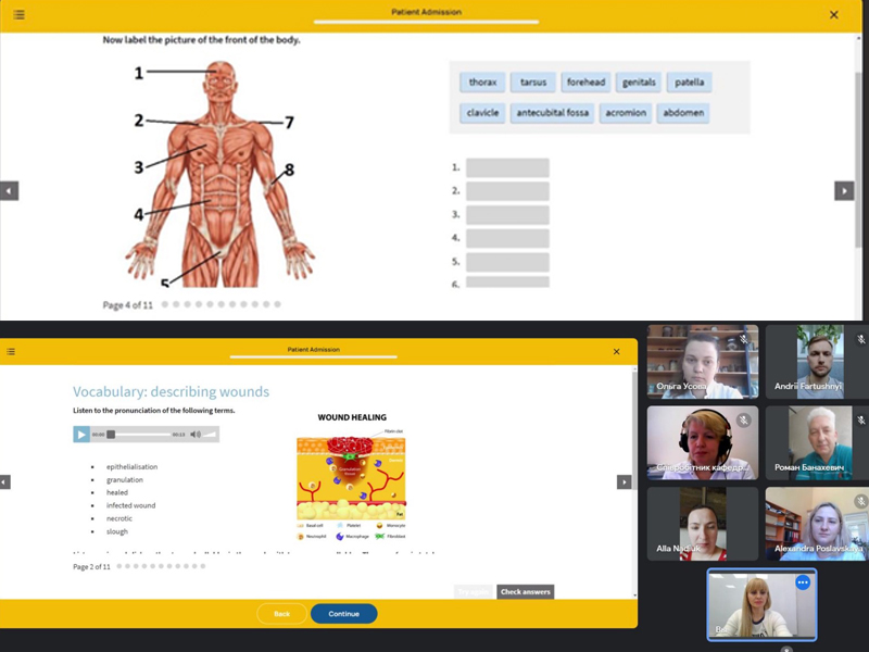З новою платформою та цікавою добіркою матеріалу є можливість вивчати необхідні професійні терміни англійською. Кожен модуль містить кілька блоків з тестами та вправами на розвиток навичок аудіювання, говоріння, читання й поповнення словникового запасу та знання медичної лексики, а також базові поради щодо вивчення специфічного лексичного шару мови. Кожен блок містить статтю Scopus для розвитку словникового запасу на рівні В2-С1, що допомагає дізнатися останні доробки світової медицини.