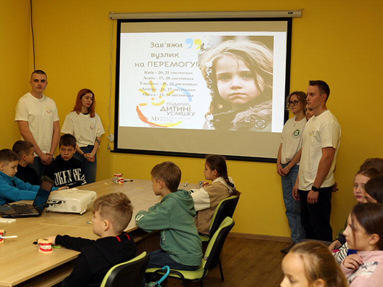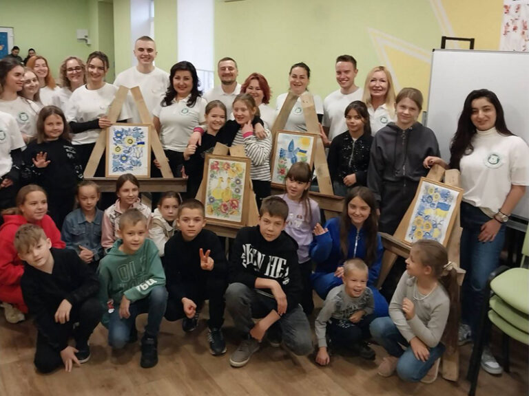 Після уроку діти взяли участь у майстер-класі з петриківського розпису. Вони малювали свої картини про перемогу мольбертах, які зробили з піддонів, в яких постачається обладнання для Збройних Сил України.