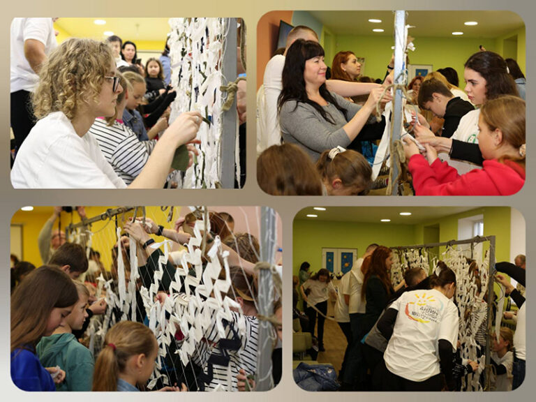Потім всі учасники заходу разом плели маскувальну сітку для наших воїнів-захисників. Діти та дорослі в’язали кожен свої маленькі вузлики заради великої загальної перемоги. Всі разом були щасливі долучитися до такої великої справи.