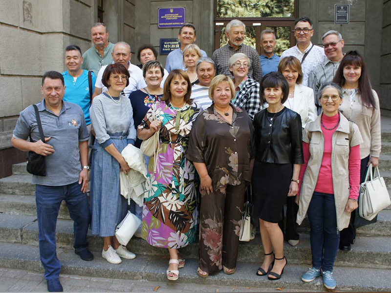 За традицією зустріч розпочалася в Музеї історії ДДМУ ім. І.І. Крижанівської. Піднімаючись сходами, випускники зупинилися біля фотостенда з іменами колег, які загинули у сучасній війні за свободу України, — вшанували їх хвилиною мовчання. Зупинили погляди на стенді з уламками шахеда, який пошкодив морфологічний корпус. На фото побачили кадри руйнувань корпусу та студентського містечка після обстрілу 16 квітня 2025 року. Багато наших випускників долучилися до збору коштів на відновлення морфологічного корпусу, який є не лише символом університету, а й архітектурною пам’яткою Дніпра.