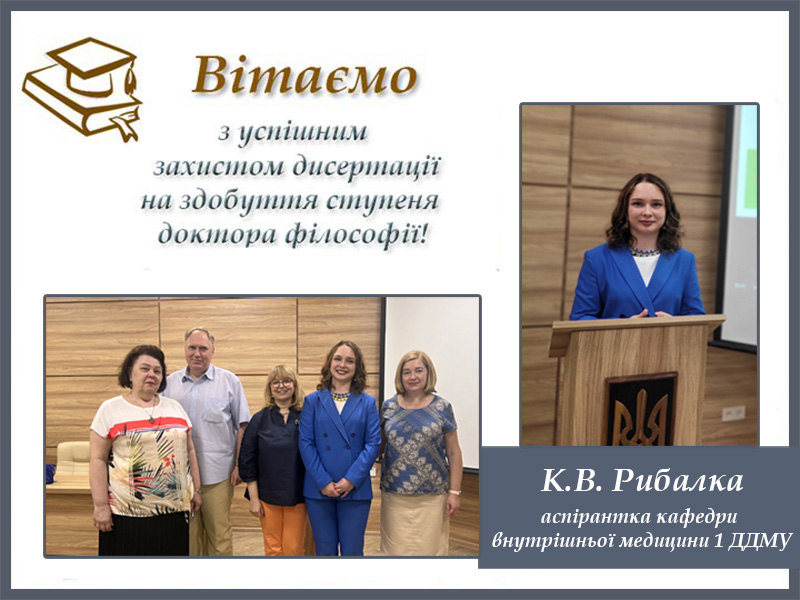 На підставі відкритого голосування спеціалізована вчена рада ДФ 08.601.117 під головуванням професора Куряти Олександра Вікторовича прийняла рішення про присудження ступеня доктора філософії (PhD) за спеціальністю 222 «Медицина», галузь знань 22 «Охорона здоров’я» Рибалці Карині Володимирівні.