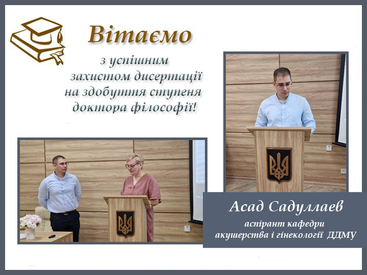 На підставі захисту дисертації спеціалізована вчена рада 08.601.118 під головуванням професора Лоскутової Тетяни Олександрівни ухвалила присудити ступінь доктора філософії Садуллаєву Асаду Садулла Огли. Спеціальність «Медицина», галузь знань «Охорона здоров’я».